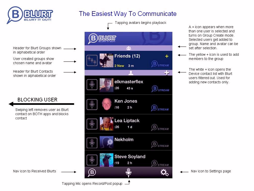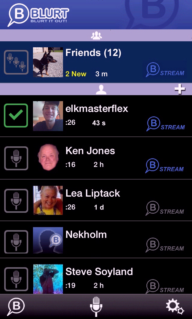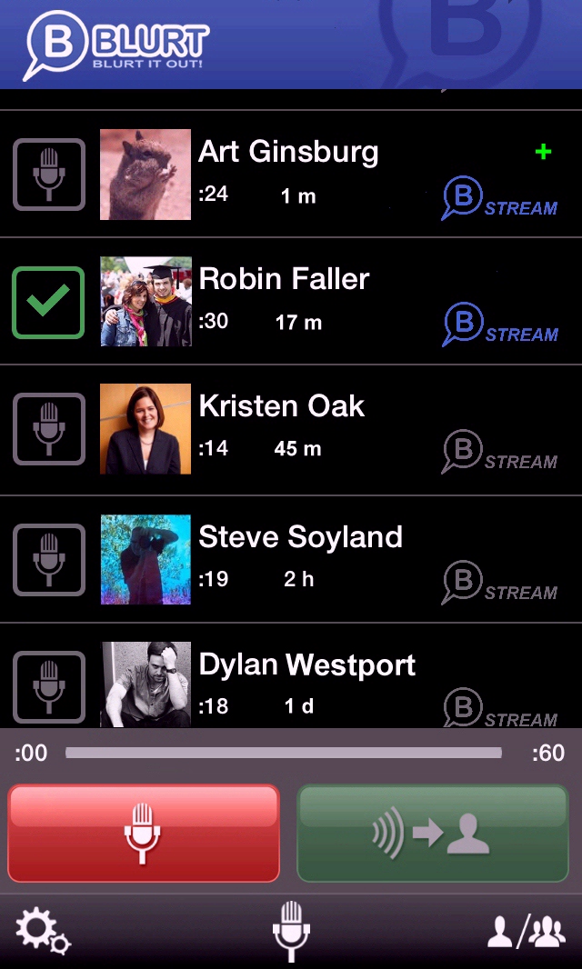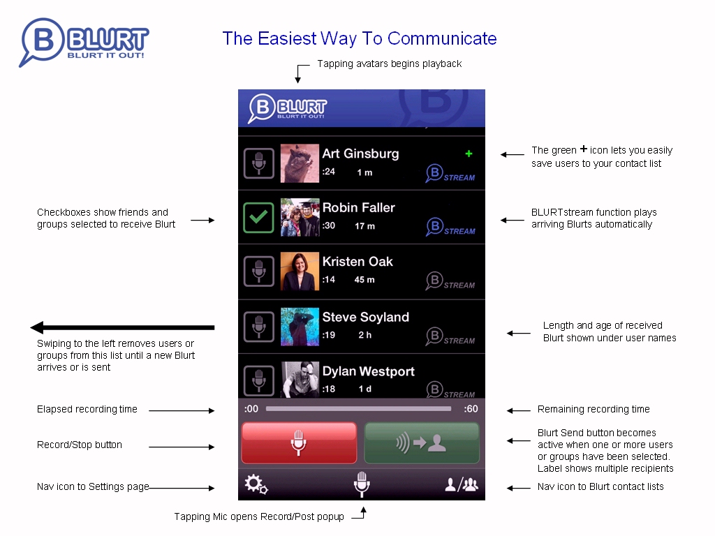 The unique “BLURTstream” feature plays your incoming messages automatically as they arrive. Be part of a group conversation just by listening.